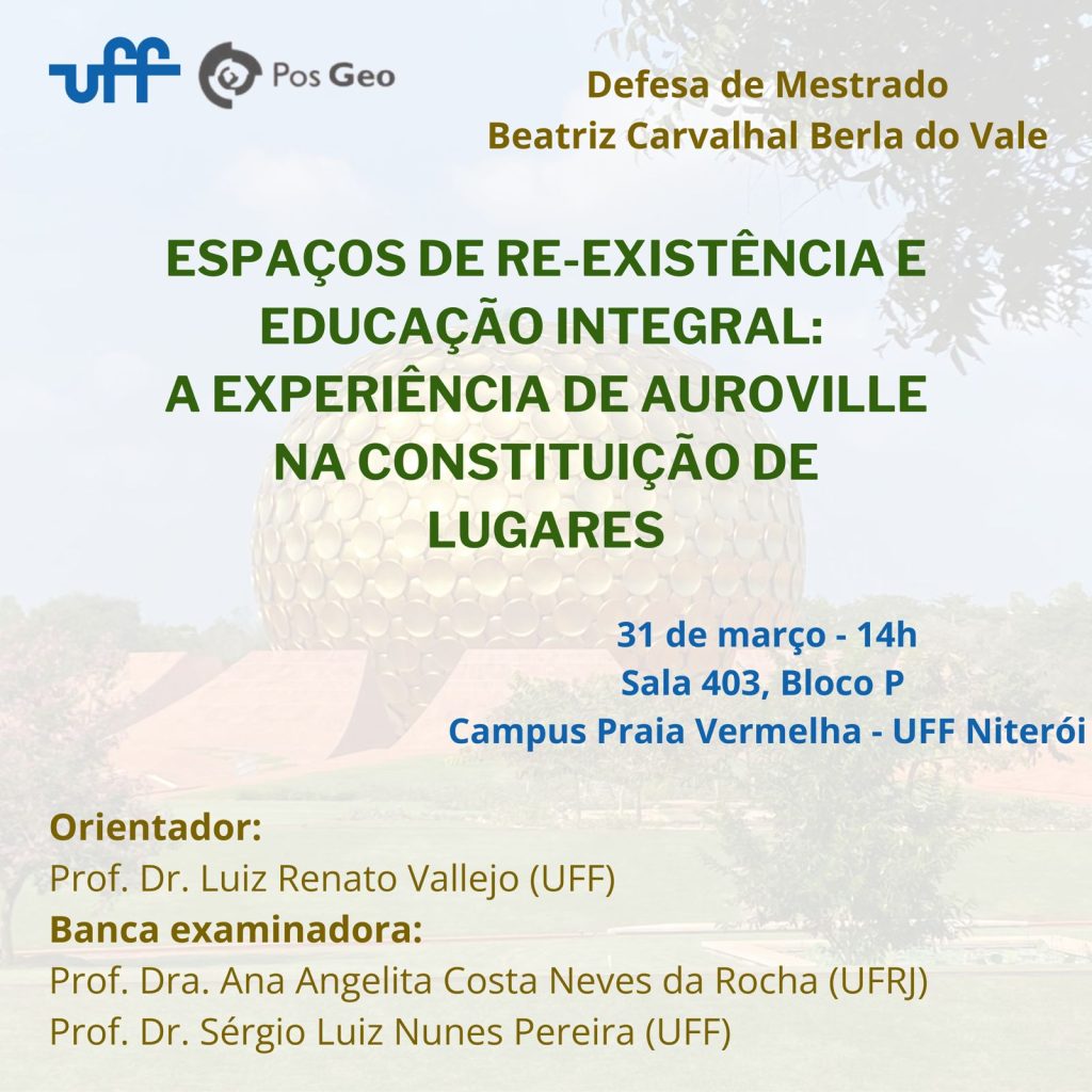 Defesa de Mestrado: Espaços de re-existência e educação integral: A experiência de Auroville na construção de lugares / Notícias / Por Webmaster